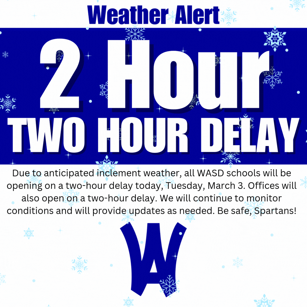 Due to anticipated inclement weather, all WASD schools will be opening on a two-hour delay today, Tuesday, March 3. Offices will also open on a two-hour delay. We will continue to monitor condition...